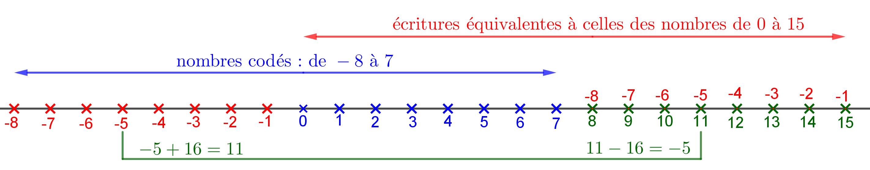 Exemple d'un codage sur \(4\) bits de nombres de \(-8\) à \(7\) :⚓︎