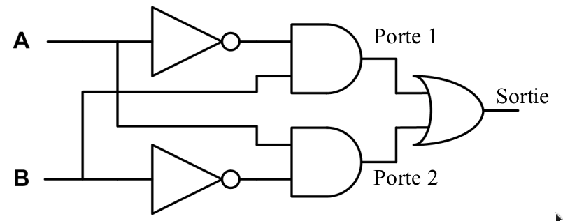 | \(A\) | \(B\) | \(\overline{A}\) | \(\overline{B}\) | Porte 1 | Porte 2 | Sortie |