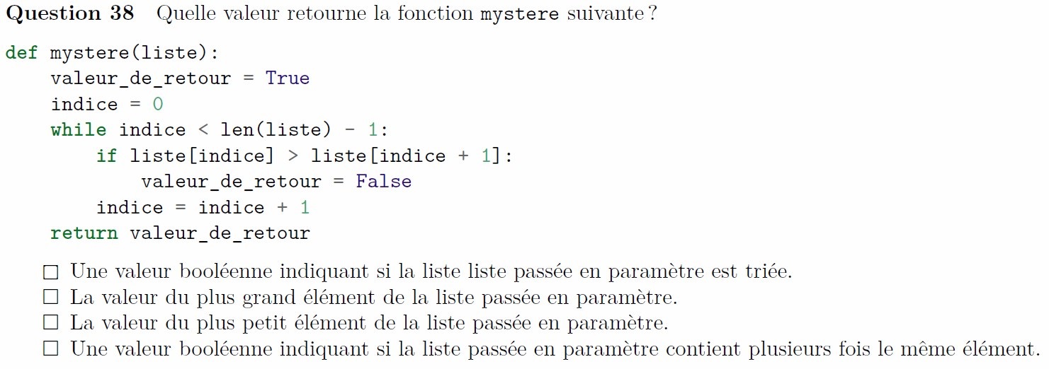 La fonction est_triee(liste) prend en argument une liste d’entiers. Cette fonction doit renvoyer True lorsque tous les éléments de cette liste sont en ordre croissant, c’est-à-dire rangés du plus petit au plus grand. Compléter le code de cette fonction (à faire en exercice) :