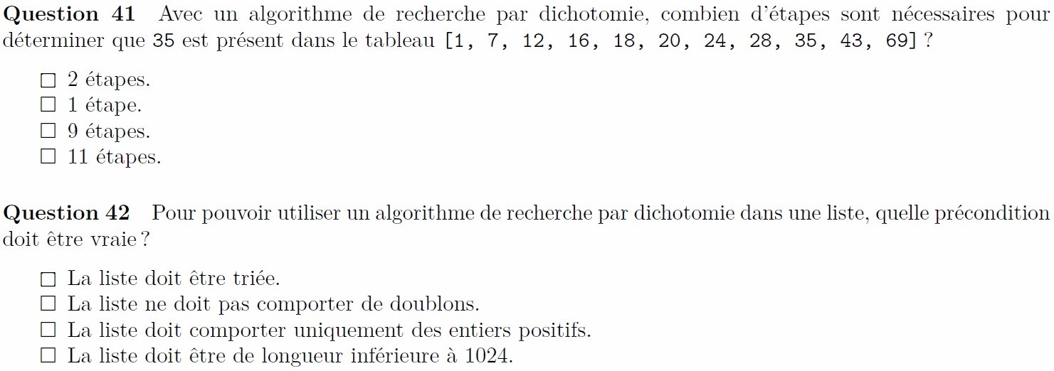 Vous avez probablement joué au jeu « trouve un nombre entre 1 et 100 » et proposé 50. Si la réponse est ’perdu, c’est plus’ vous proposez 75 et si l’on vous répond ’perdu c’est moins’ vous proposez 62... C’est une recherche dichotomique !