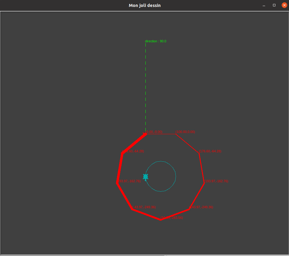 t2.write("direction : "+str(t2.heading())) # On affiche l'angle de direction actuel